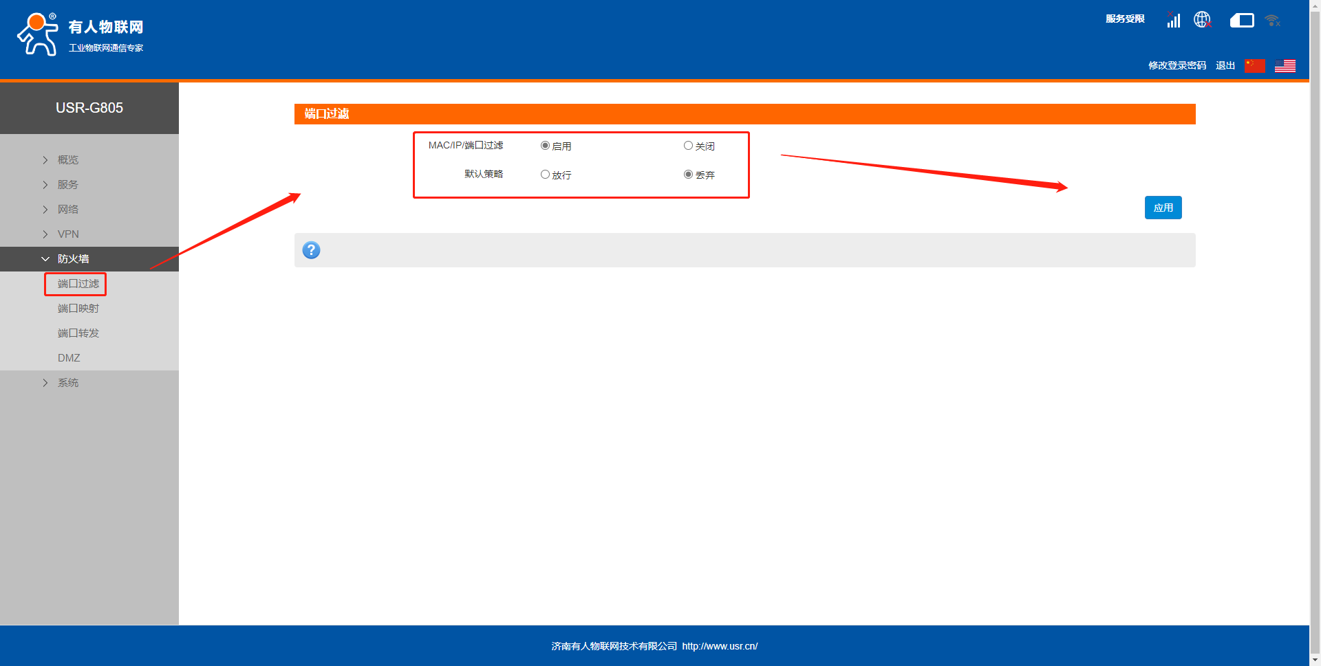 4. 在內(nèi)置網(wǎng)頁(yè)--防火墻中端口過(guò)濾界面進(jìn)行設(shè)置,啟用此功能之后點(diǎn)擊應(yīng)用。