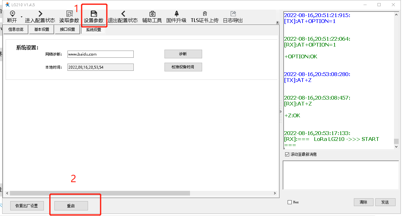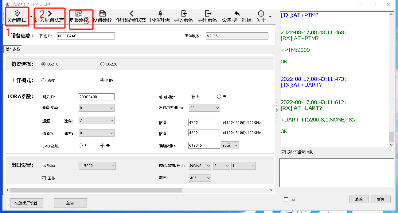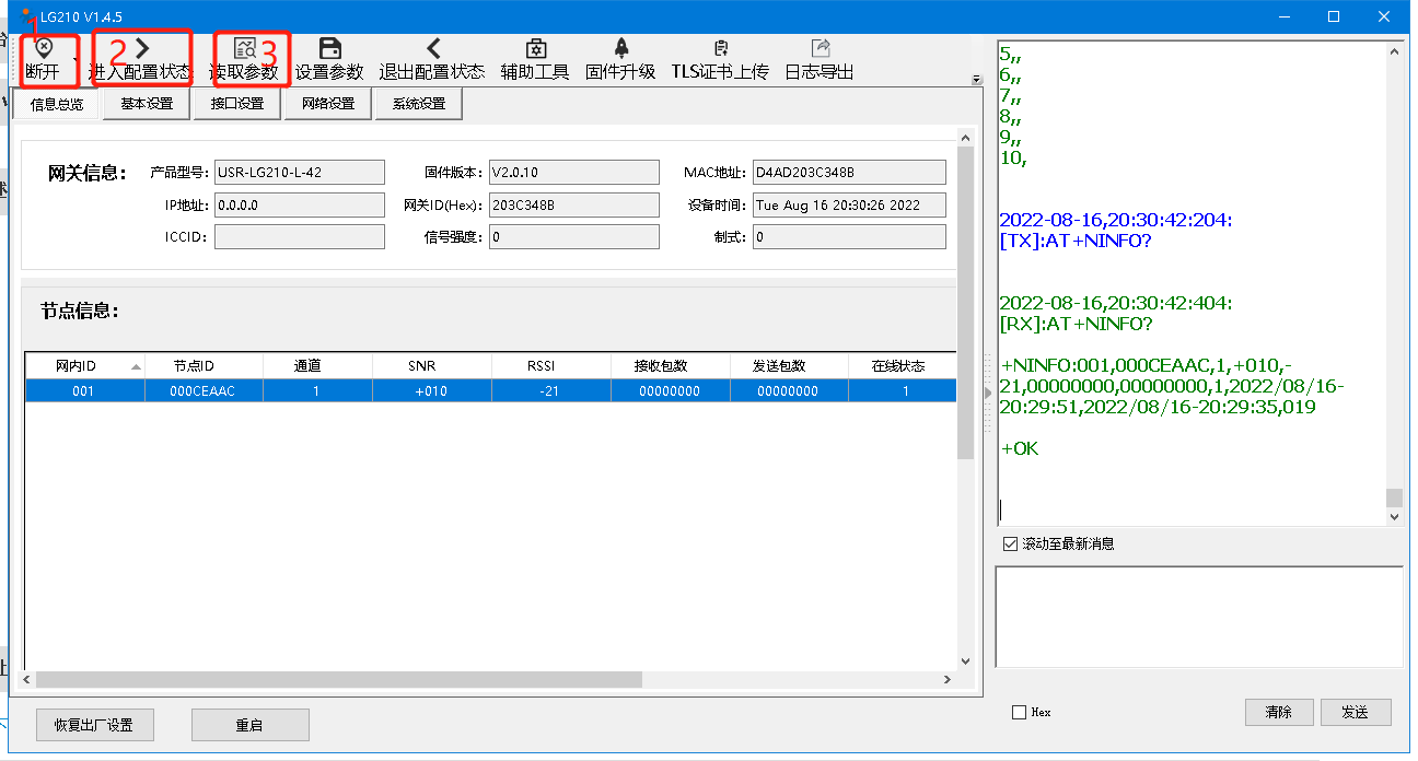 2. 找到LG210對應的串口打開串口,點擊進入配置狀態(tài),讀取參數(shù)。