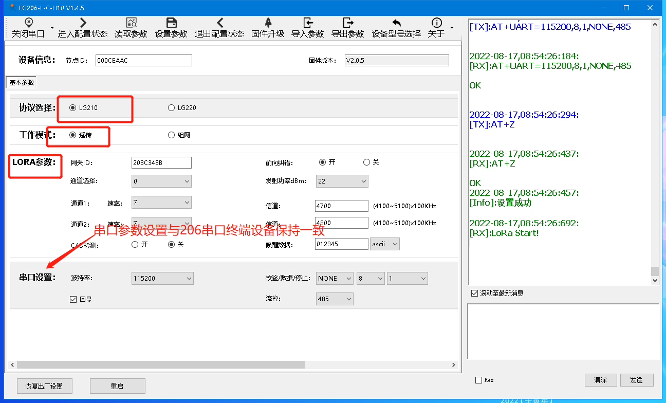接口設置:LORA參數(shù):通道一頻率4700,速率:7