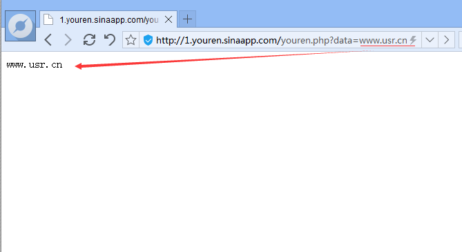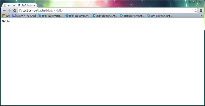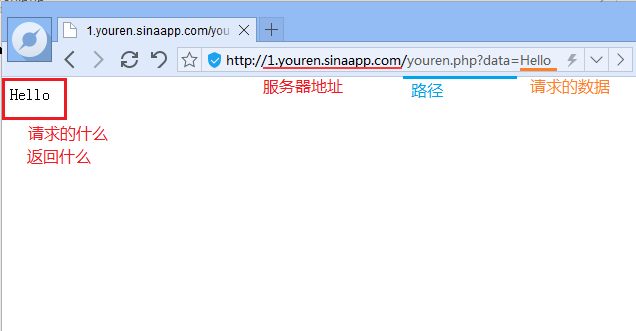 在瀏覽器上輸入http://1.youren.sinaapp.com/youren.php?data=Hello ,請求地址和路徑要與以上HTTPD_Client統(tǒng)一匹配。