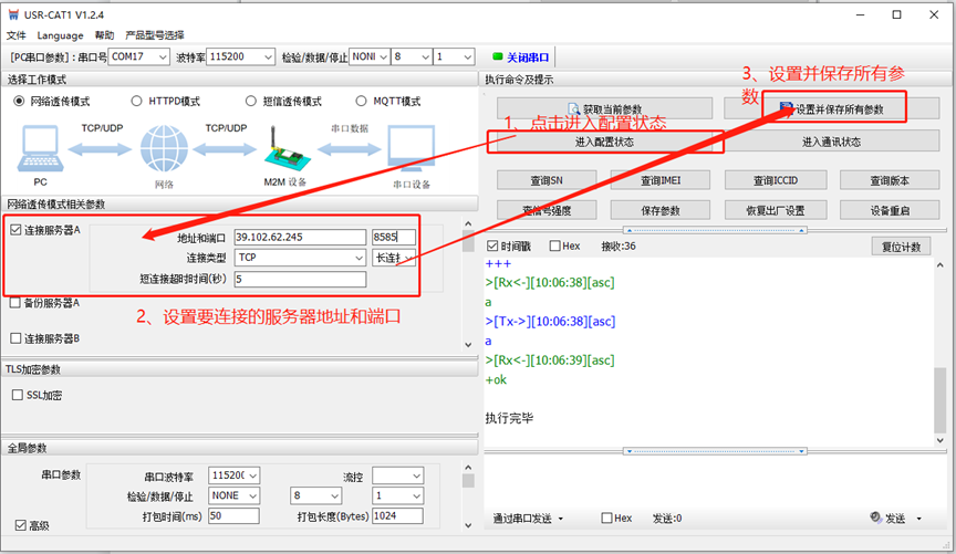 2)點(diǎn)擊進(jìn)入配置狀態(tài),將勾選連接服務(wù)器A,將服務(wù)器的IP和端口填入。之后點(diǎn)擊保存并設(shè)置所有參數(shù)