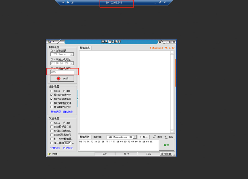 1、搭建好TCP服務(wù)器,或租賃一個TCP服務(wù)器(此處測試我們以租賃的服務(wù)器為例,在服務(wù)器上打開一個網(wǎng)絡(luò)助手來模擬TCP server)