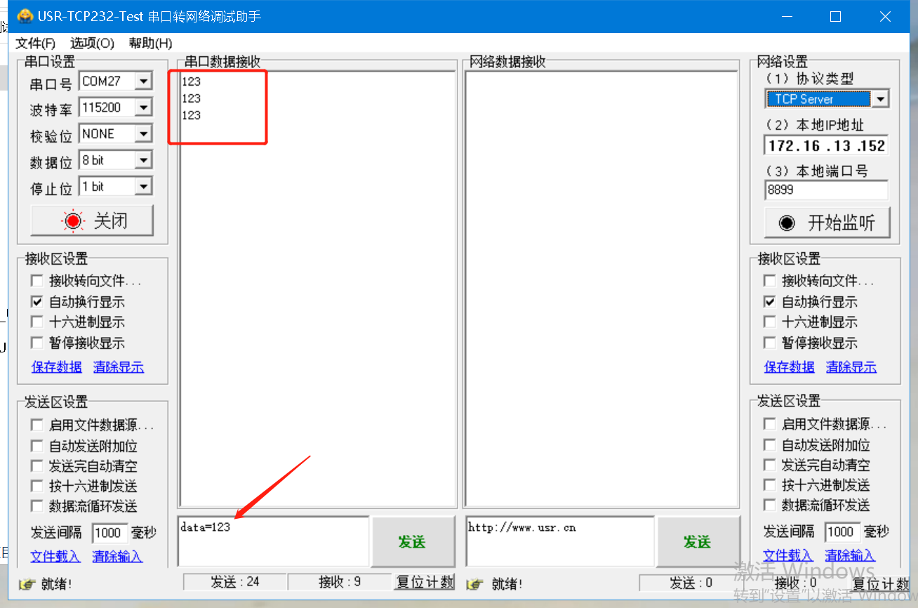 安裝測試軟件(建議關(guān)閉電腦的防火墻以及殺毒軟件)使用設(shè)備在電腦端生成的com口,用設(shè)備默認(rèn)的串口參數(shù)打開串口,在串口段發(fā)送數(shù)據(jù):data=123可以看到服務(wù)器返回值為123。由此成功建立httpd client測試。