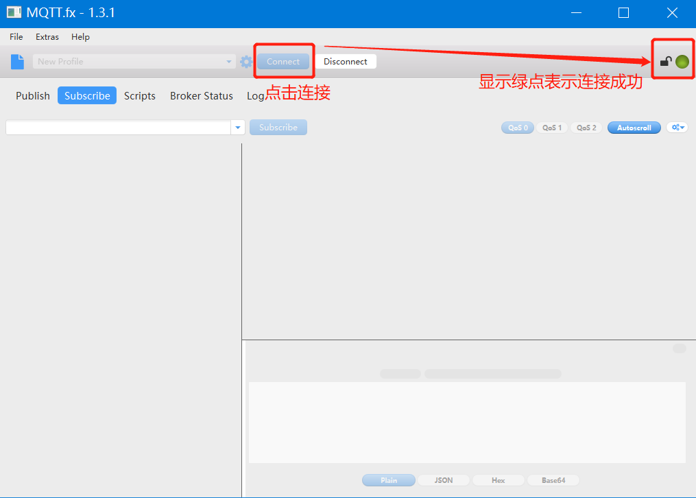 5.打開MQTT Client 軟件:MQTT.FX,點(diǎn)擊左下角新建1個(gè)客戶端,填寫好MQTT服務(wù)器的參數(shù)后,點(diǎn)擊“Connect”,右側(cè)出現(xiàn)綠點(diǎn)表示連接成功。