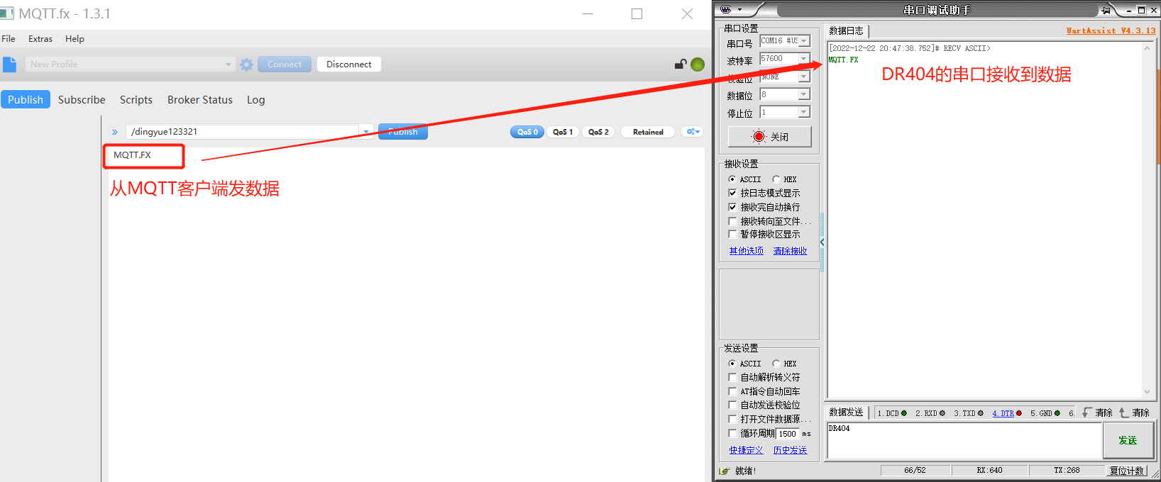 選擇好對(duì)應(yīng)的串口參數(shù)后,點(diǎn)擊打開串口,進(jìn)行數(shù)據(jù)測(cè)試??梢钥吹綇?/span>MQTT客戶端發(fā)數(shù)據(jù),DR404串口端收到數(shù)據(jù);從DR404串口端發(fā)送數(shù)據(jù),MQTT客戶端也可以收到數(shù)據(jù),數(shù)據(jù)通信成功。