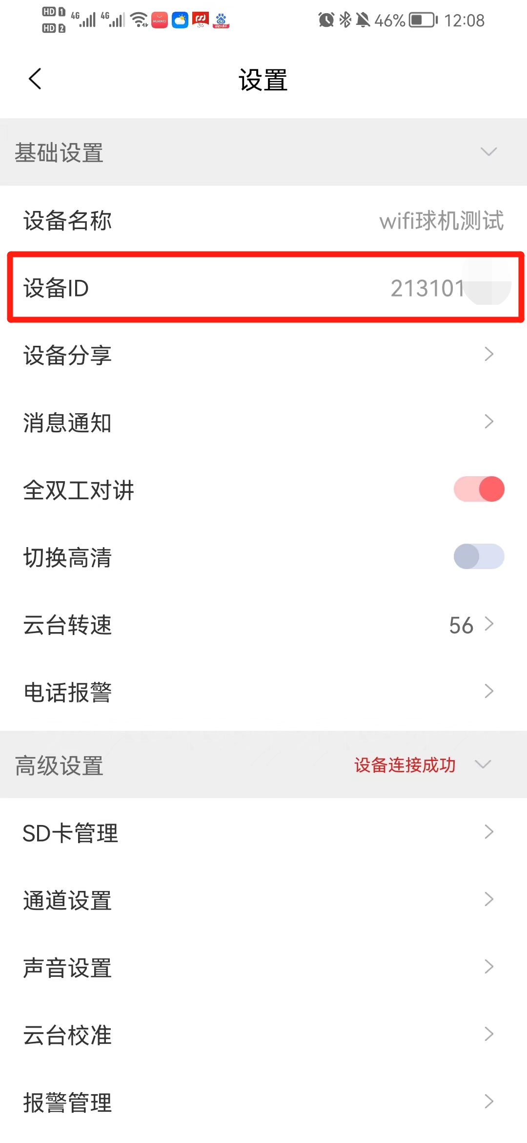 8.點(diǎn)擊WiFi球機(jī)右上角設(shè)置按鈕獲取到設(shè)備ID號