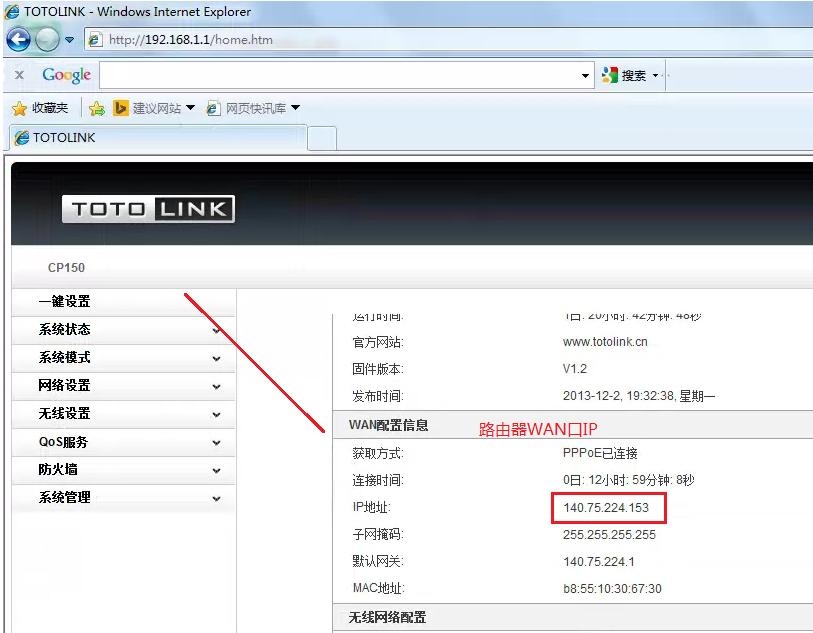 3:進去路由器網(wǎng)頁查看路由器的WAN口IP是否為公網(wǎng)IP。將搜索到的IP與路由器WAN口地址進行比對,IP地址相同則可以實現(xiàn)此功能。