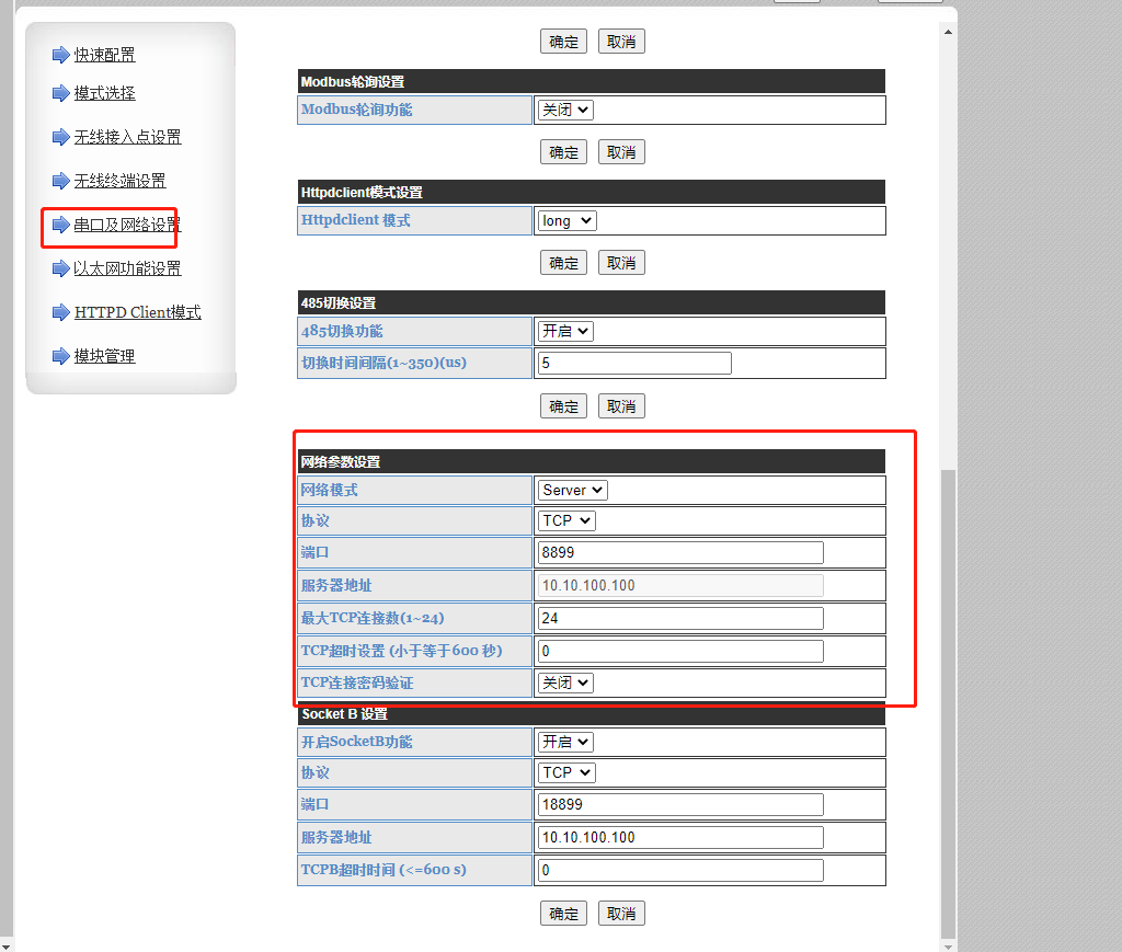 網(wǎng)絡參數(shù)設置為TCP server模式,本案例以默認為主。