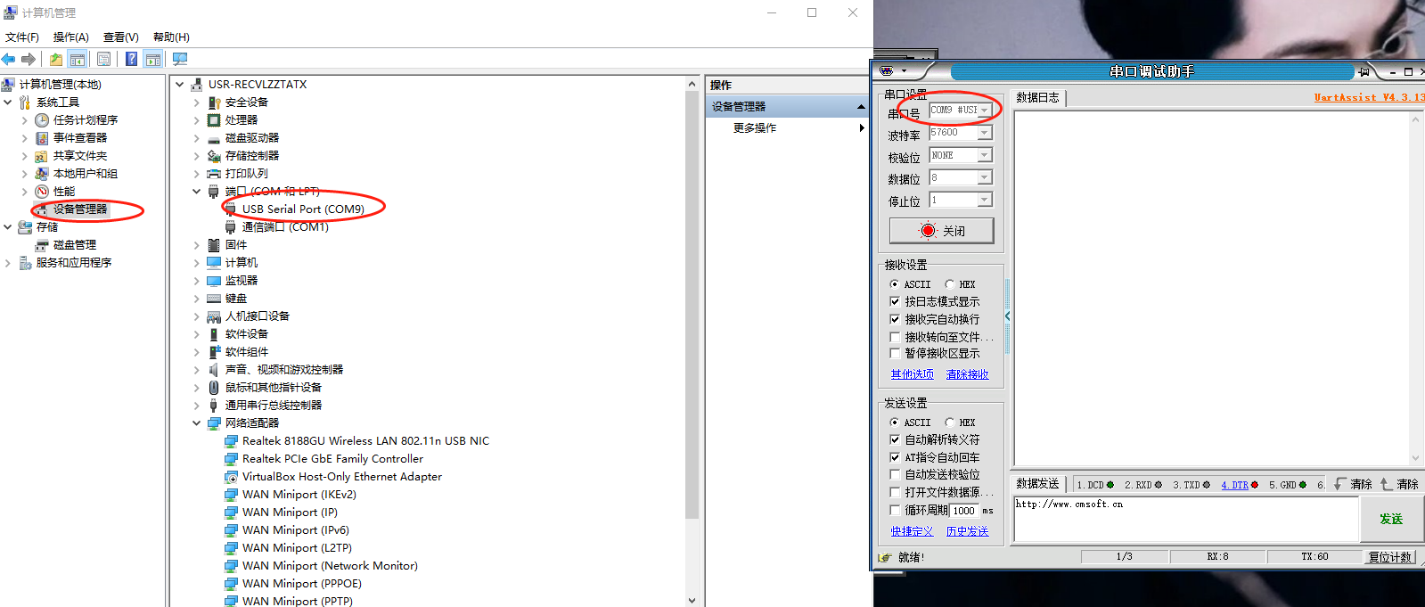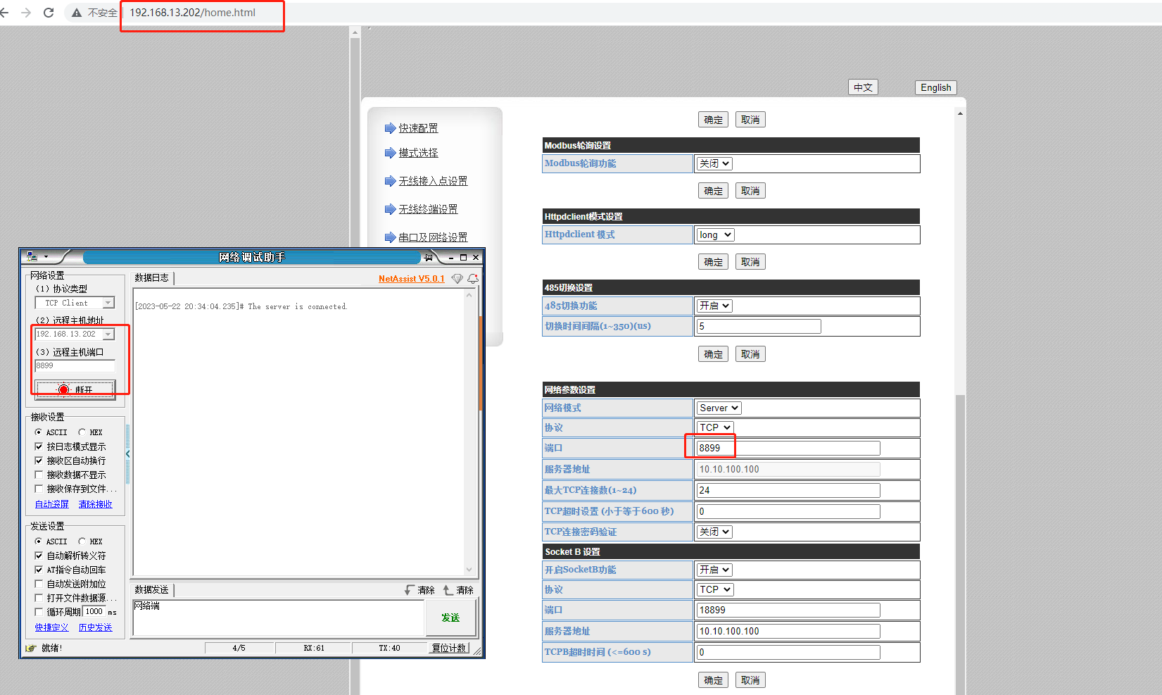 4、可以看到串口調(diào)試助手和網(wǎng)絡調(diào)試助手數(shù)據(jù)是通訊的。
