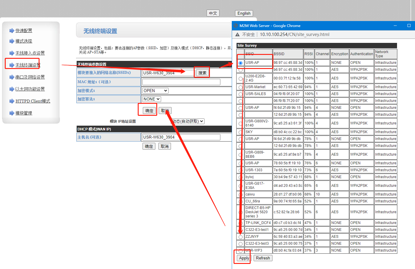 2、配置W630為STA模式,搜索可以連接上網(wǎng)的路由器。注意:每一步都要保存,全部設置完畢后點擊重啟