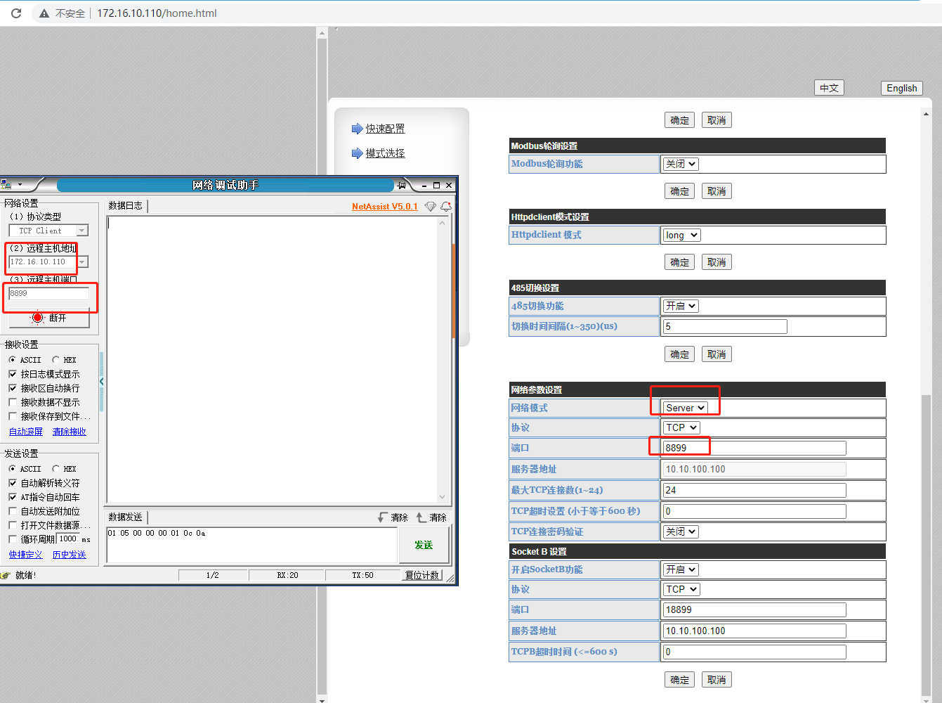 3、USB轉(zhuǎn)232的串口線接電腦,打開一個(gè)串口調(diào)試助手模擬終端設(shè)備,可以看到串口和網(wǎng)絡(luò)端的數(shù)據(jù)正常通訊。