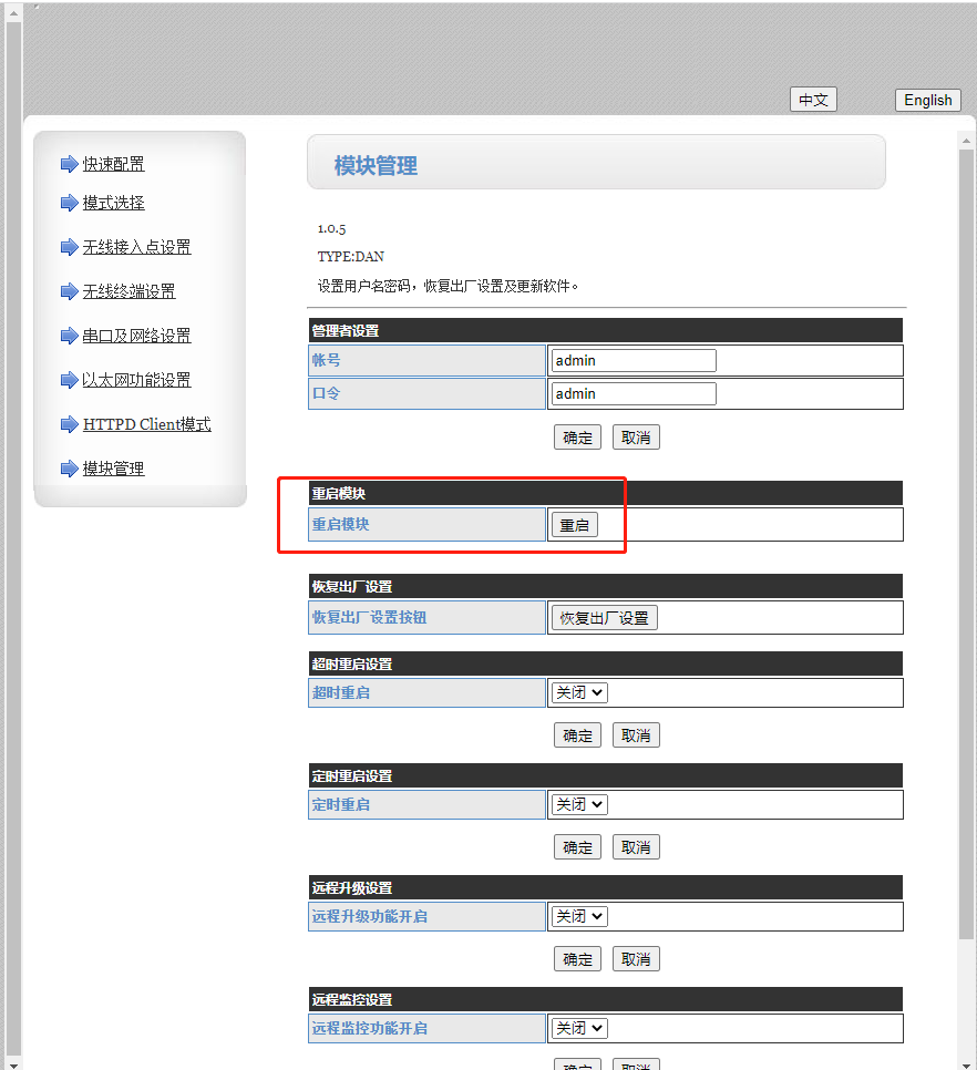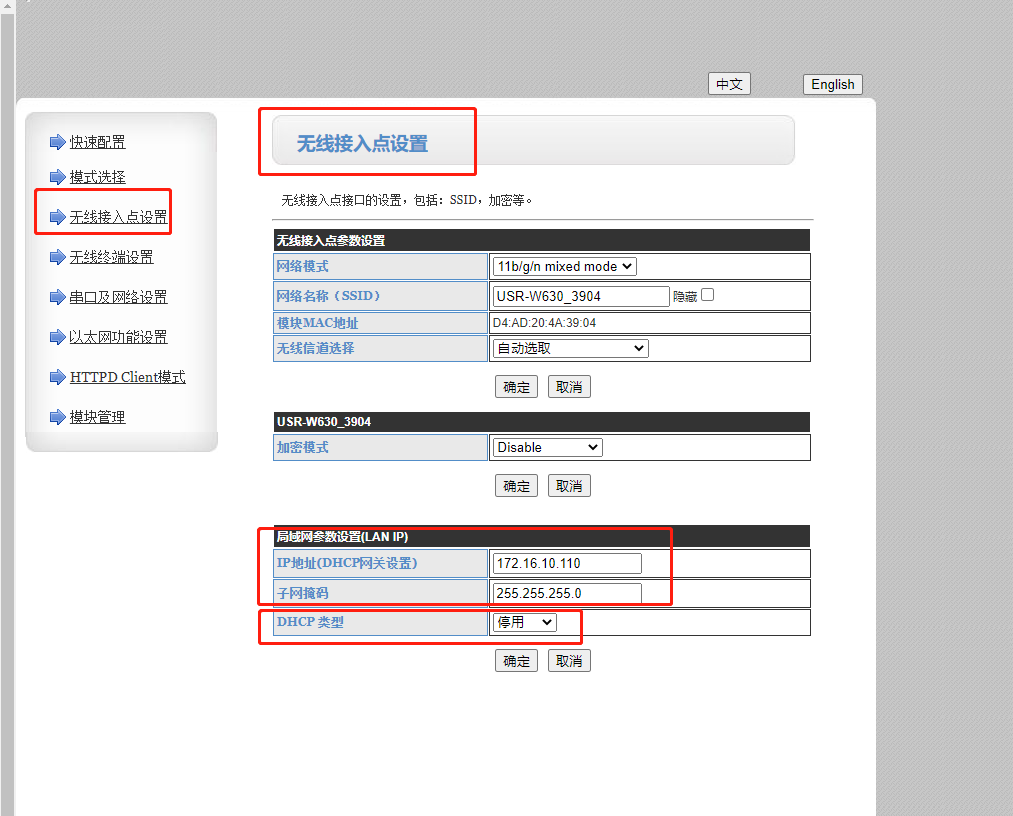 3、配置【無(wú)線接入點(diǎn)設(shè)置】 將模塊的 DHCP 服務(wù)器關(guān)掉,并將 IP 修改成跟上級(jí)路由器一個(gè)網(wǎng)段。本案例上級(jí)路由網(wǎng)段為172.16.10.X。