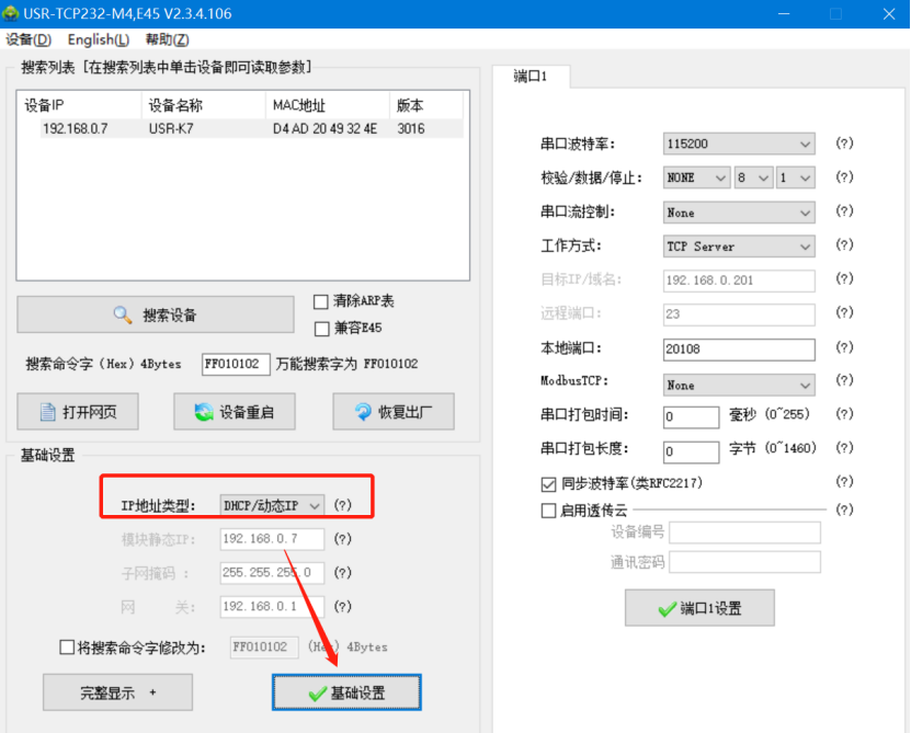 3. 打開M4設(shè)置軟件,點(diǎn)擊搜索設(shè)備,可看到搜索到的設(shè)備,點(diǎn)擊選中,可看到IP地址類型為靜態(tài)IP