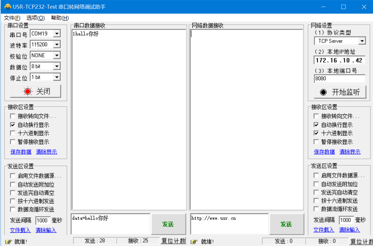 7. 打開串口,串口參數(shù)和K7的串口參數(shù)保持一致,發(fā)送data=hello你好,返回?cái)?shù)據(jù)hello你好