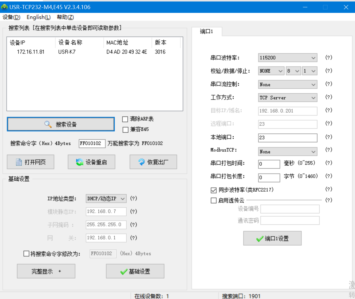 5. 網(wǎng)線直連K7的網(wǎng)口和路由器的LAN口,保證K7正常上網(wǎng),電腦連接路由器的WiFi,電腦和路由器同一網(wǎng)段,設(shè)置軟件重新搜索設(shè)備,可看到路由器分配給K7的IP