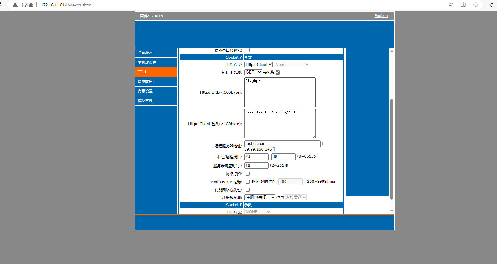 6. 在谷歌瀏覽器輸入IP 172.16.11.81,打開k7內(nèi)置網(wǎng)頁(yè),用戶名密碼都為admin。模塊設(shè)置為Httpd Client模式,請(qǐng)求方式GET,URL為/1.php,設(shè)置服務(wù)器地址test.usr.cn,端口80,設(shè)置并保存所有參數(shù),重啟模塊。(本說明文檔使用為有人測(cè)試服務(wù)器)