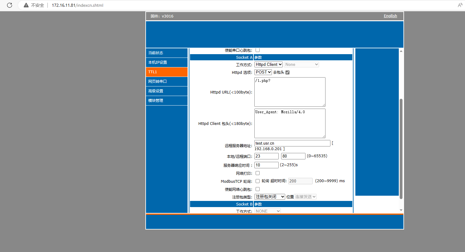 6. 在谷歌瀏覽器輸入IP 172.16.11.81,打開k7內(nèi)置網(wǎng)頁,用戶名密碼都為admin。模塊設(shè)置為Httpd Client模式,請求方式POST,URL為/2.php,設(shè)置服務(wù)器地址test.usr.cn,端口80,設(shè)置并保存所有參數(shù),重啟模塊。(本說明文檔使用為有人測試服務(wù)器)