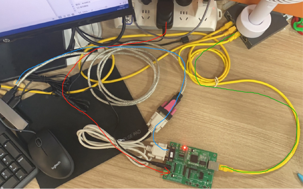 把USR-TCP232-ED2模塊放到評(píng)估板上,用232轉(zhuǎn)usb串口線連接電腦,網(wǎng)口直連電腦,檢測(cè)硬件連接無錯(cuò)誤后,接入我們配送的電源適配器,給ED2模塊供電。