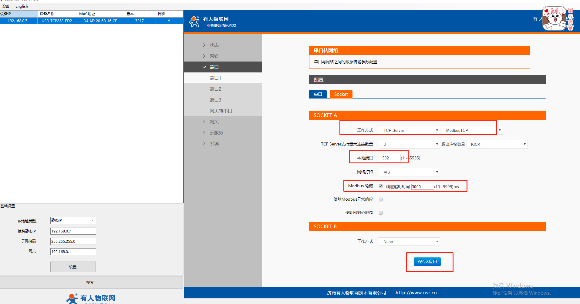 Socket:設(shè)置ED2的工作模式是TCPserver,開啟modbus TCP,