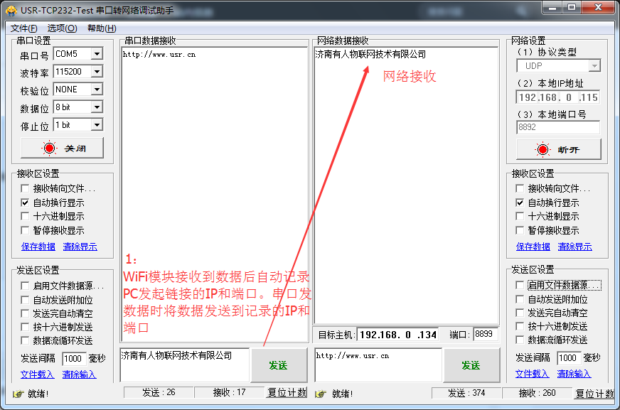 2:串口測試,將WiFi模塊連接到電腦的串口上,電腦的設置管理器上顯示為COM5.測試串口向網絡,網絡向串口端的數據透傳。