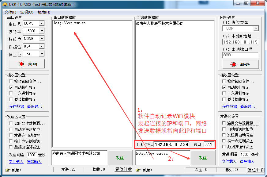 1:進入配置網頁,設置socka協(xié)議為UDP server,UDP server端口8899 。socka服務器地址可以設置為電腦的IP,這個服務器地址是代表WiFi模塊串口接收到數據后,將數據發(fā)送到網絡端,如果模塊沒有記錄來源IP和端口的話,模塊自動將數據發(fā)送到服務器地址和socka端口。設置完成后重啟WiFi模塊