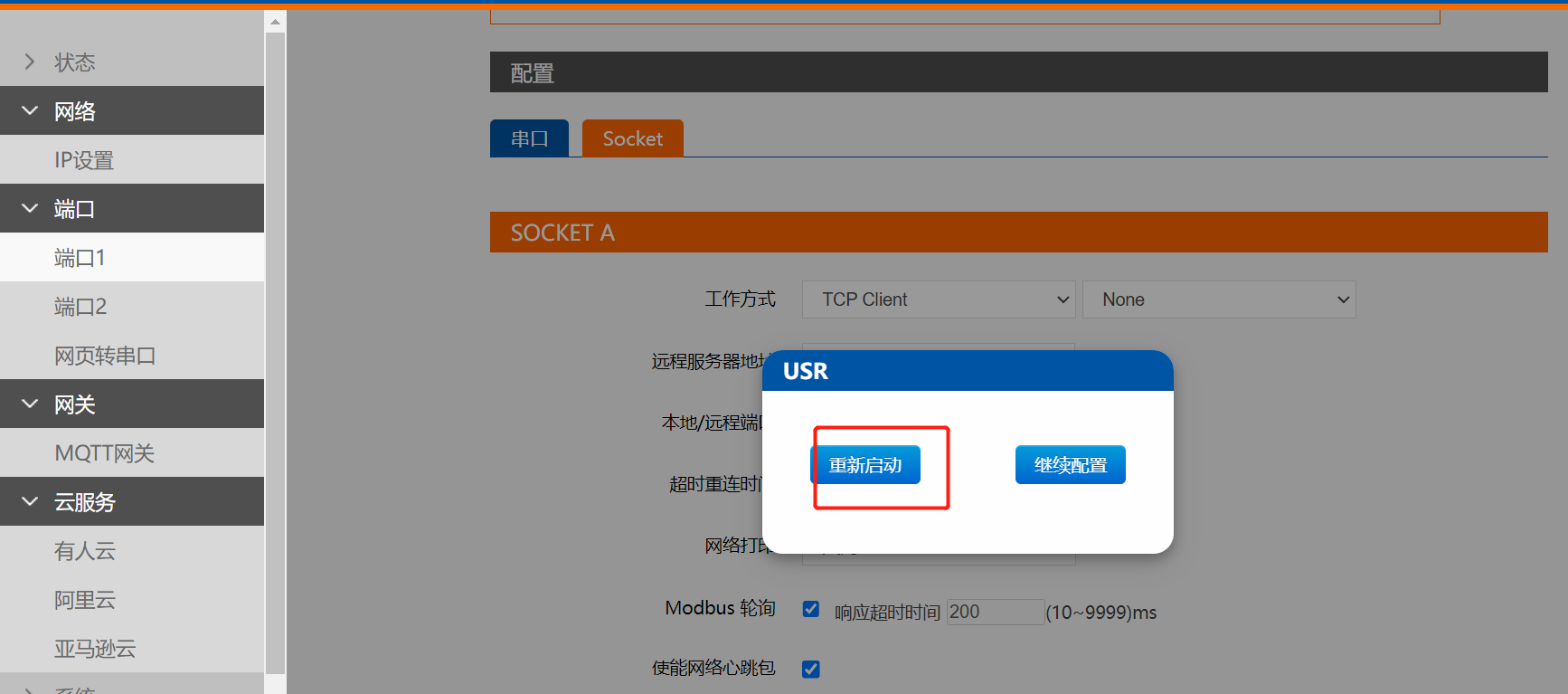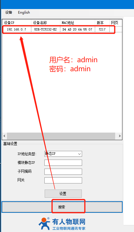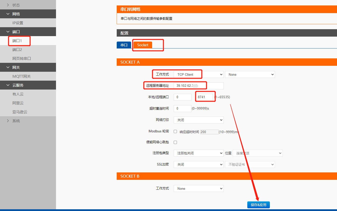 點(diǎn)擊“搜索設(shè)備”當(dāng)搜索列表中出現(xiàn)E2的設(shè)備后,單擊搜索到的設(shè)備,查看其配置信息,設(shè)置模塊的ip,串口參數(shù)跟終端保持一致,Socket工作方式選擇Tcp client,本地端口0,填寫您遠(yuǎn)程服務(wù)器的ip和遠(yuǎn)遠(yuǎn)程服務(wù)器的端口,然后點(diǎn)擊保存應(yīng)用,最后重啟模塊。