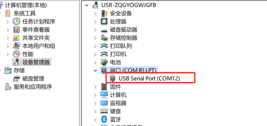 3、E2的串口接串口轉(zhuǎn)usb到電腦,在設(shè)備管理器中查看端口信息,確定USR-TCP232-EVB評(píng)估板串口使用的串口號(hào),如下圖所示電腦端口號(hào)為COM12。