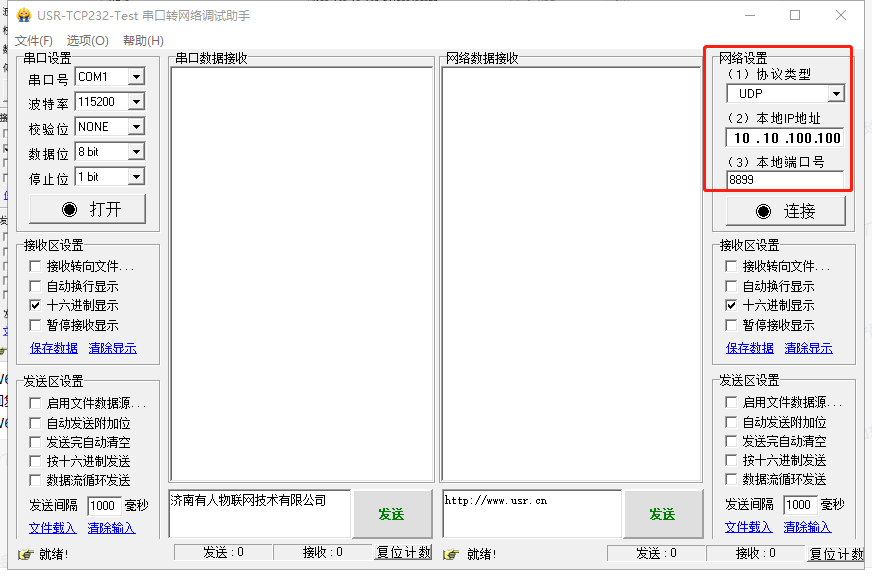 1.安裝并打開USR-TCP232-TEST測(cè)試工具,設(shè)置右側(cè)網(wǎng)絡(luò)端協(xié)議為UDP,本機(jī)IP設(shè)置為電腦鏈接W610wifi獲取的IP地址