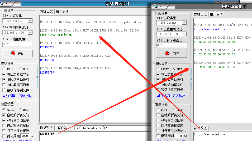 一臺(tái)電腦做tcp server,開(kāi)啟監(jiān)聽(tīng), 另一臺(tái)電腦做tcp client 進(jìn)行連接,數(shù)據(jù)通信測(cè)試。