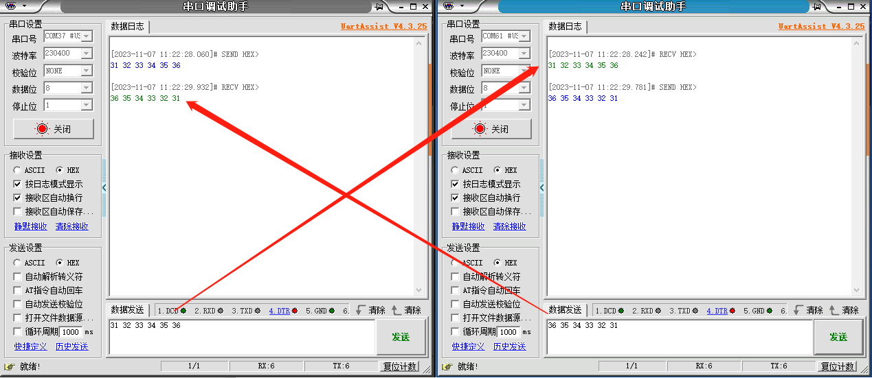 設備的兩串口分別用串口軟件打開可以測試數(shù)據(jù)相互透傳。