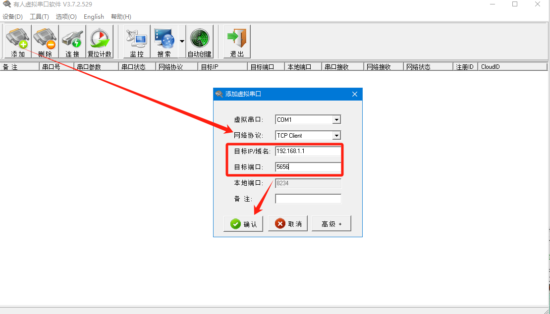 7、若使用虛擬串口,則(1-5)上述配置不變,打開(kāi)虛擬串口,點(diǎn)擊手動(dòng)添加,選擇為 TCP Client,設(shè)置上W660的本地IP和本地端口,點(diǎn)擊確定
