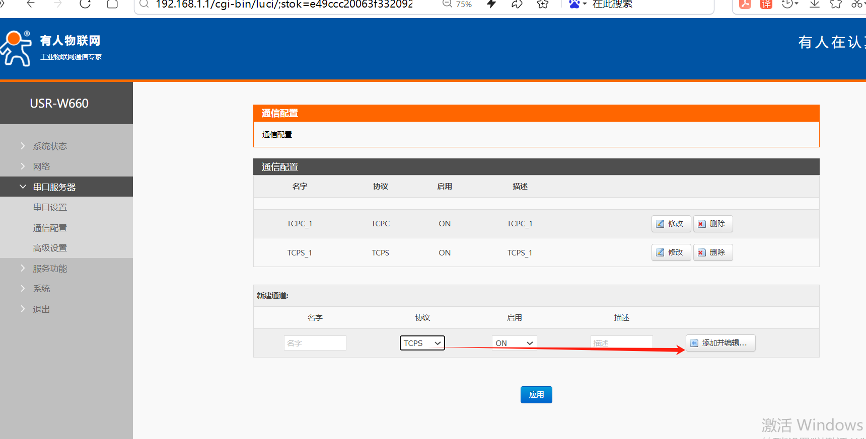 4、W660設(shè)置為TCP SERVER.設(shè)置方法如下,點(diǎn)擊添加并編輯