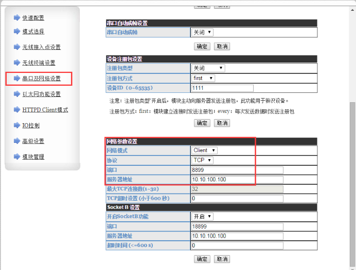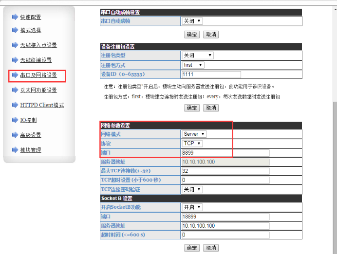 1:進(jìn)入配置網(wǎng)頁10.10.100.254(登錄帳號和密碼默認(rèn)為admin),在串口及網(wǎng)絡(luò)設(shè)置中設(shè)置網(wǎng)絡(luò)模式為TCP server,端口8899 。點(diǎn)擊確定,重啟模塊。