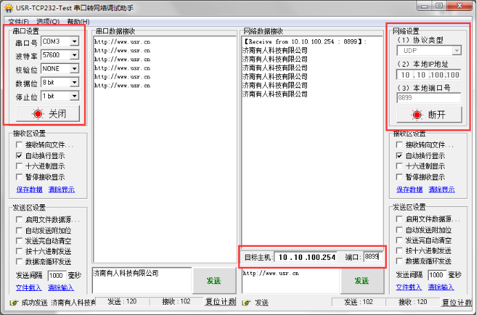3.通信測試,串口向網(wǎng)絡(luò)發(fā)送及網(wǎng)絡(luò)向串口發(fā)送均可正常收到。