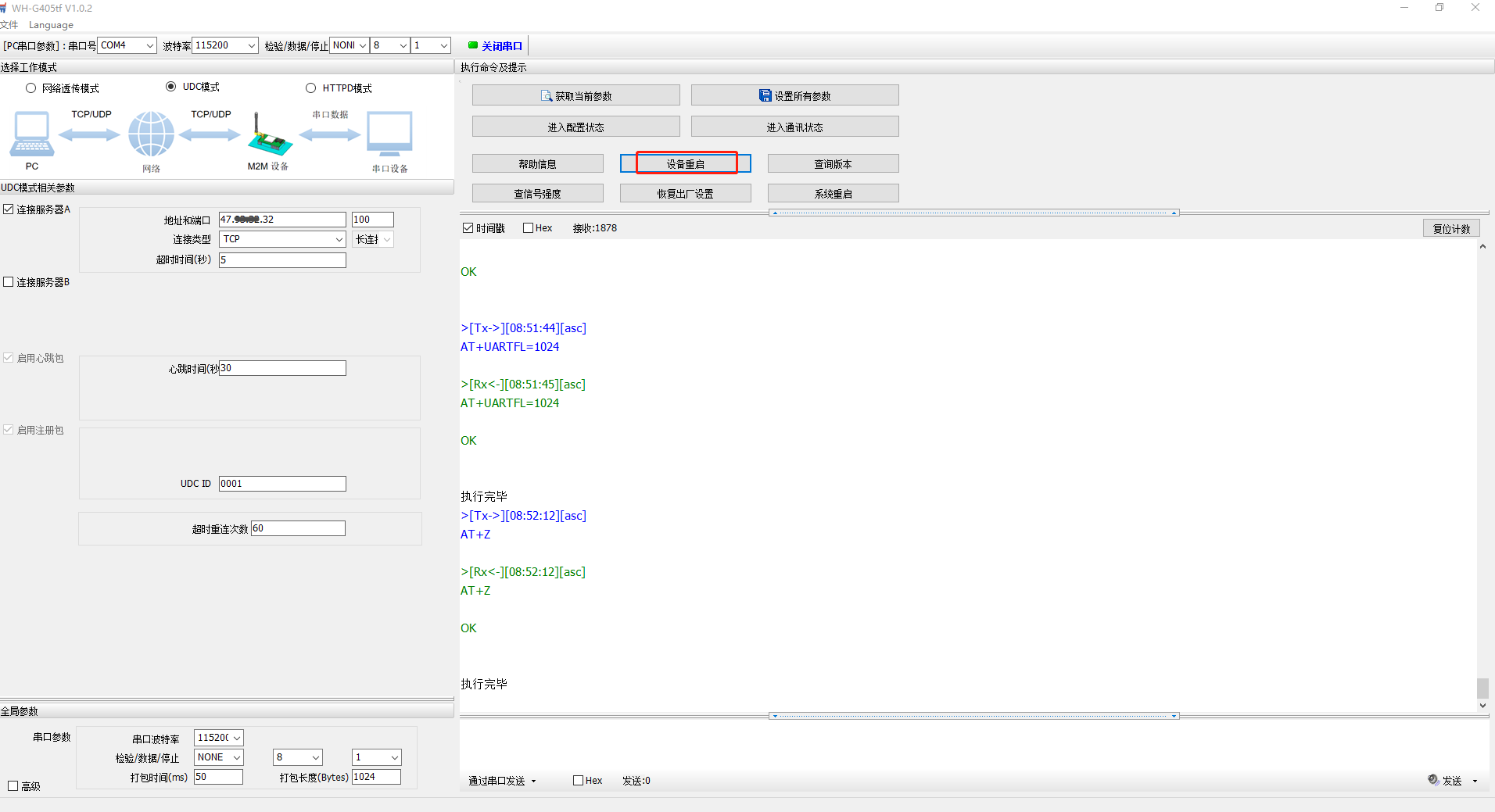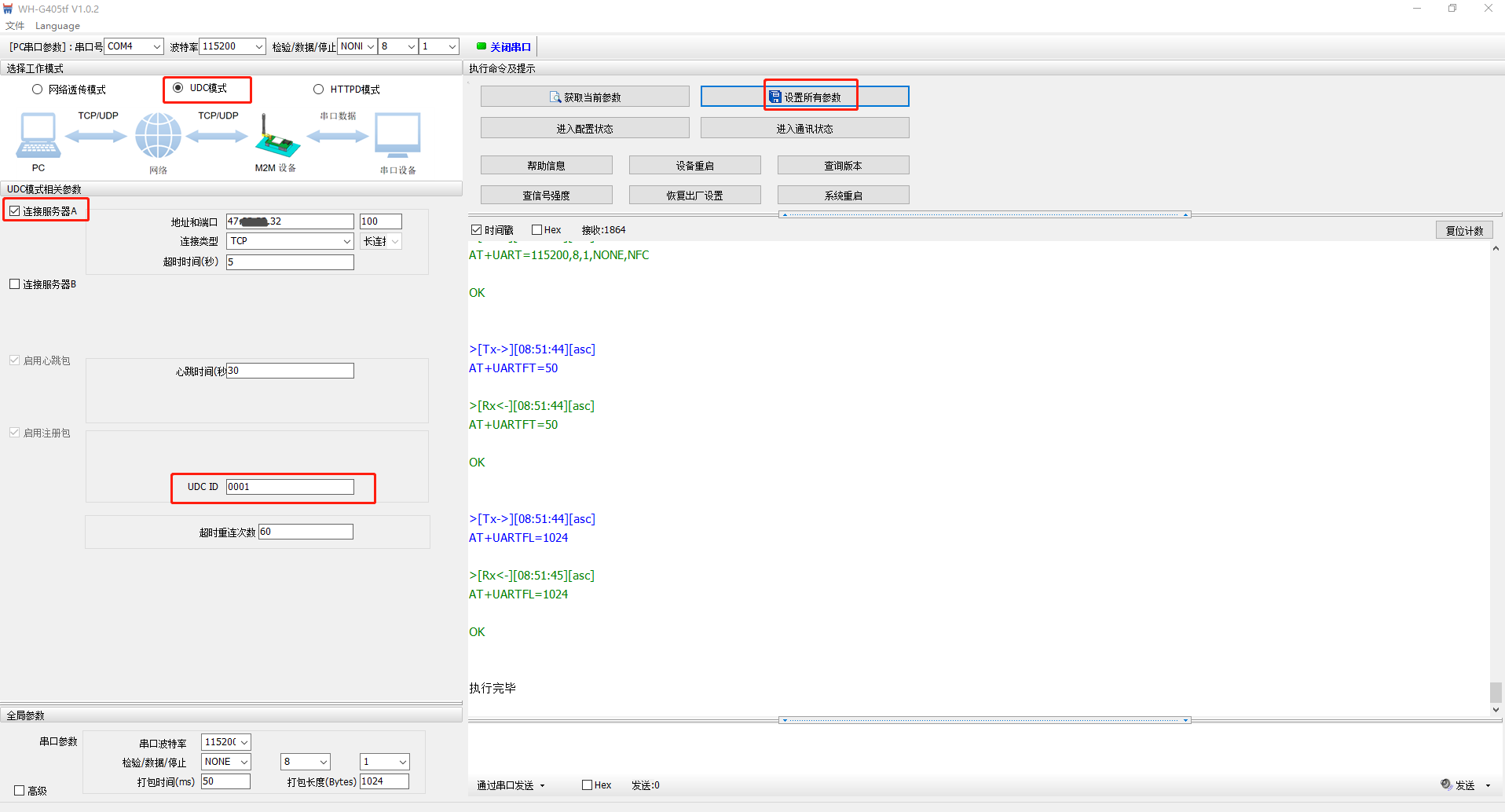 4、選擇UDC模式,勾選連接服務(wù)器A,地址設(shè)置要連接的遠程服務(wù)器地址,端口100,連接類型TCP,長連接。UDC ID用0001。設(shè)置完參數(shù),點擊設(shè)置所有參數(shù),點擊設(shè)備重啟。