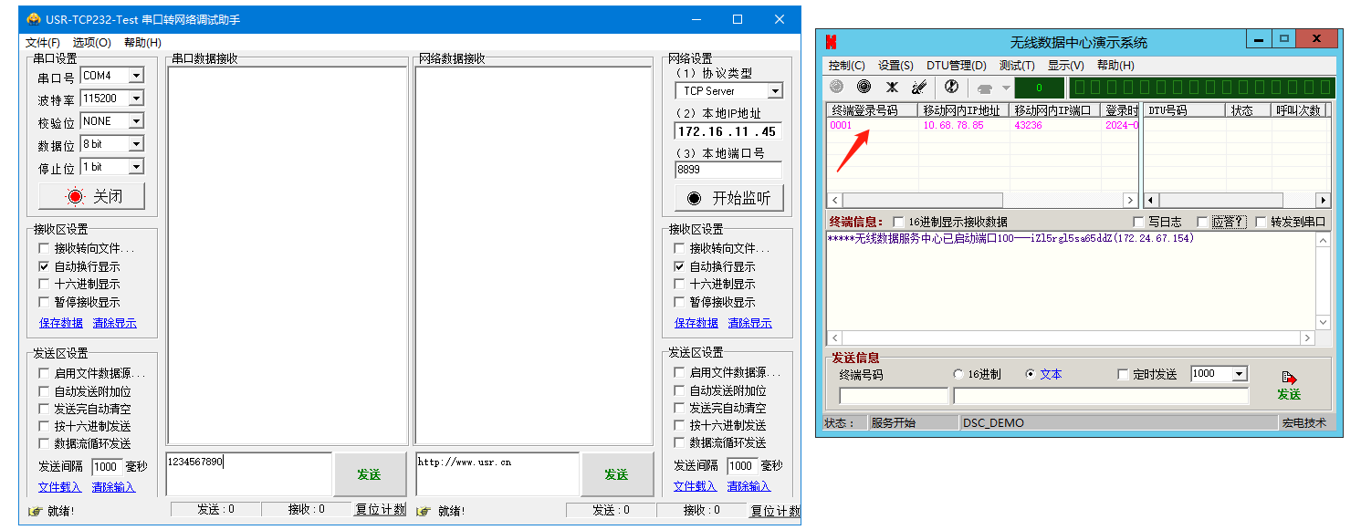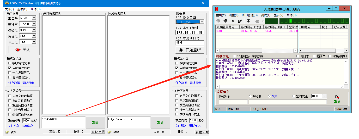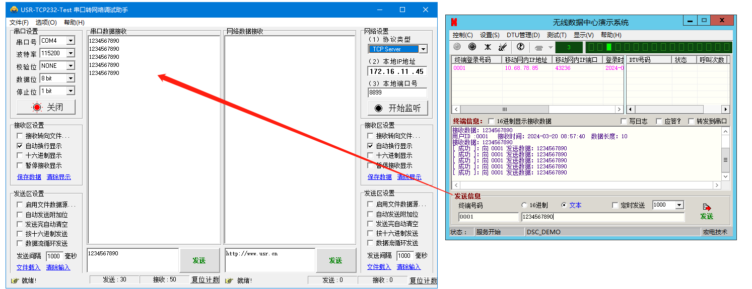 6、無線數(shù)據(jù)中心演示系統(tǒng)發(fā)送信息區(qū),對終端號碼0001,發(fā)送1234567890,WH-LTE-7S4 V2連接的串口助手,接收到數(shù)據(jù)1234567890。