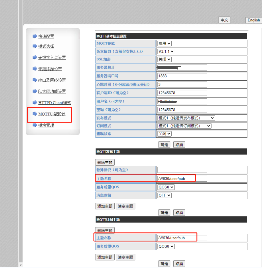(2)配置MQTT發(fā)布主題和訂閱主題
