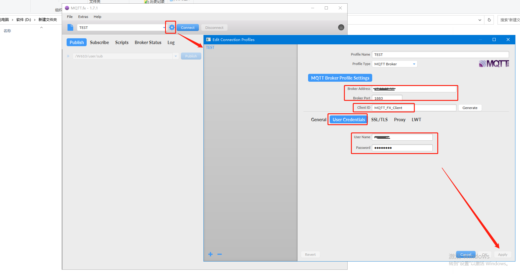 填寫MQTT服務(wù)器的用戶名和密碼。點擊APPLY。點擊Connect連接。