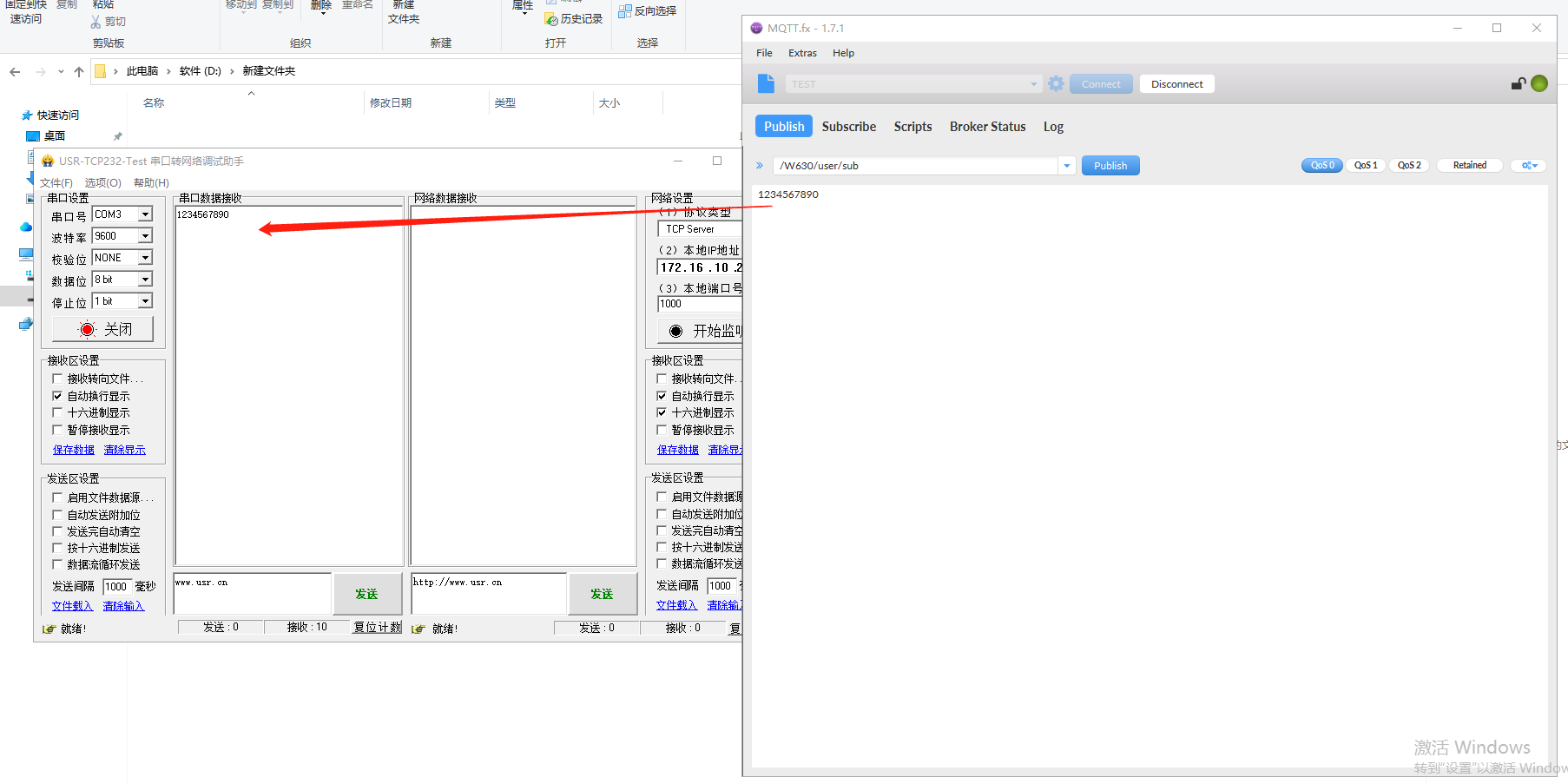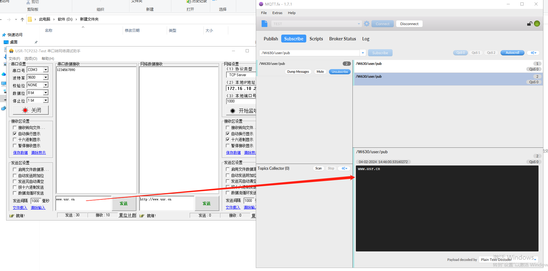 MQTTfx 軟件發(fā)送數(shù)據(jù),W630串口使用串口助手,9600波特率,打開USB-RS485串口線COM口,COM3,可以接收到數(shù)據(jù)。