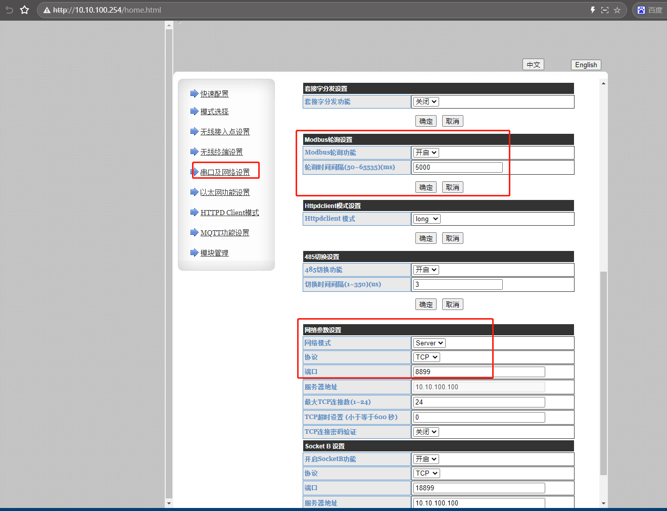 網(wǎng)頁上設(shè)置AP模式,開啟MODBUS TCP轉(zhuǎn)MODBUS RTU模式,點(diǎn)擊確定。