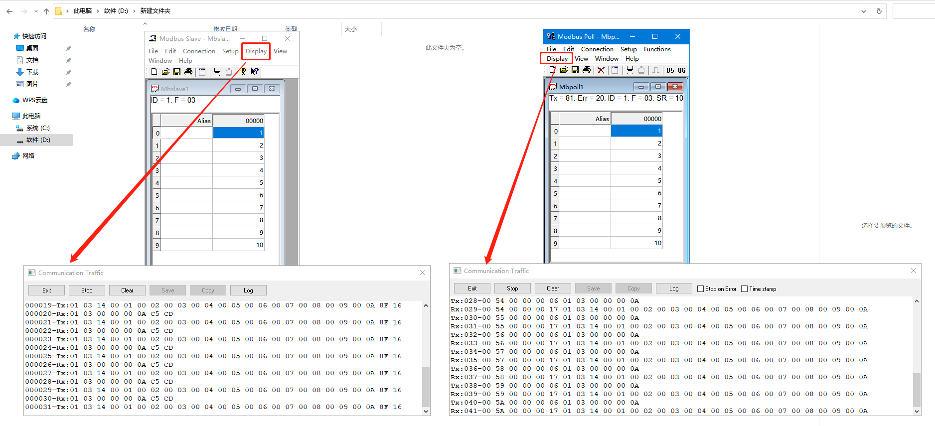 用MODBUS SLAVE軟件改變數(shù)值,MODBUS POLL就可以讀取到數(shù)據(jù),還可以監(jiān)控?cái)?shù)據(jù)。