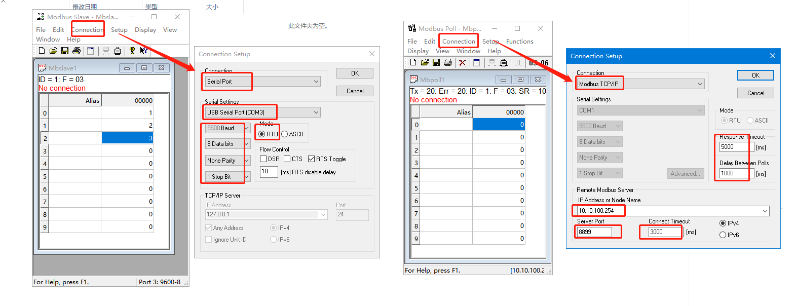 打開MODBUS POLL軟件,設(shè)置MODBUS TCP,IP填W630的IP 10.10.100.254,服務(wù)器的端口填8899。配置好3個(gè)時(shí)間參數(shù)。