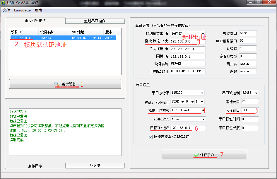 (2)模塊默認(rèn)IP地址為192.168.0.7。電腦固定IP設(shè)置為192.168.0.201。