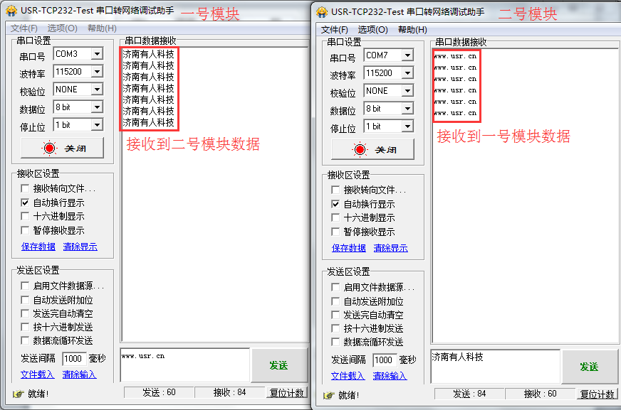 1.該應(yīng)用中兩個(gè)USR-KX系列模塊組成局域網(wǎng)實(shí)現(xiàn)點(diǎn)對(duì)點(diǎn)連接,這樣的組網(wǎng)方式為兩個(gè)用戶設(shè)備搭建了一個(gè)透明串口通路。