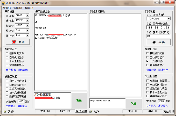 3、手機(jī)端接收GM3串口發(fā)送的數(shù)據(jù):你好,手機(jī)短信發(fā)送:測(cè)試成功,在串口可以收到