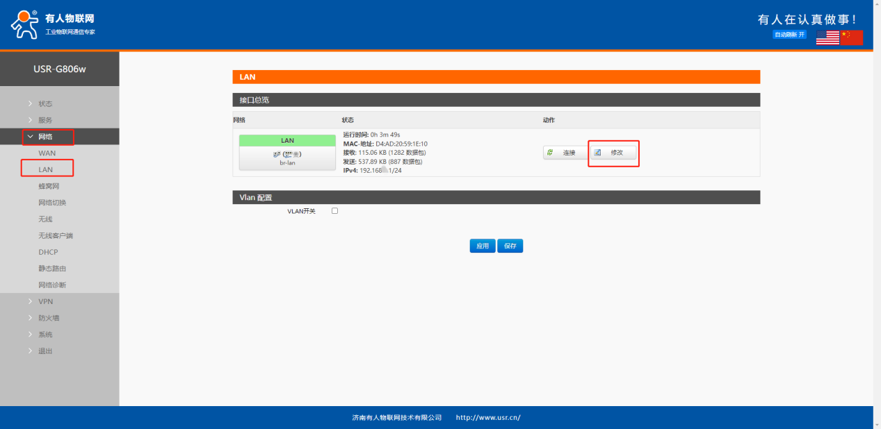 為了避免網(wǎng)段沖突,修改lan口為192.168.2.1。在網(wǎng)絡(luò)--LAN點(diǎn)擊修改,修改完成后點(diǎn)擊應(yīng)用,等待一分鐘后給設(shè)備斷電重啟。