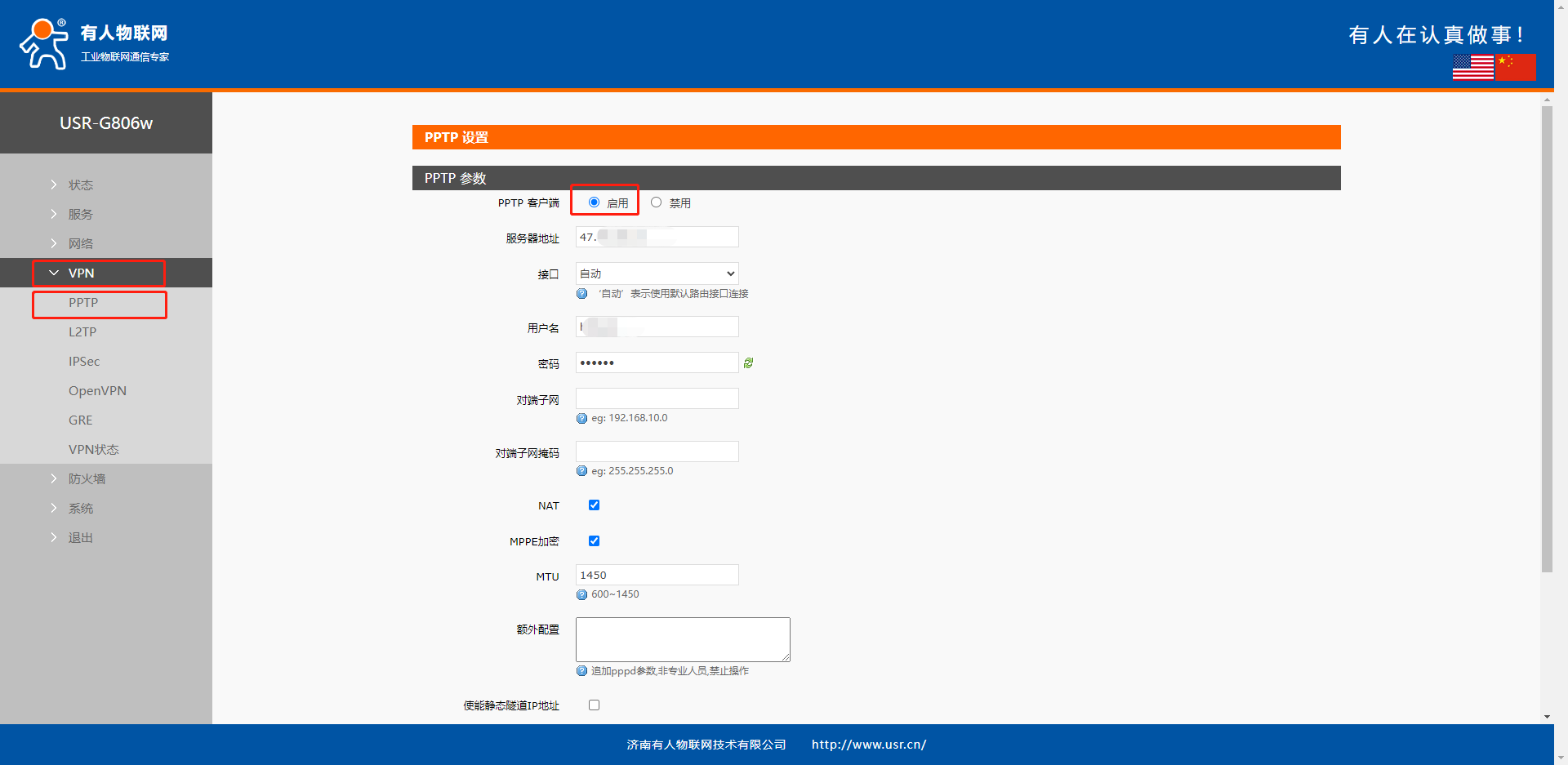 在VPN--PPTP勾選啟用,相關(guān)參數(shù)與服務(wù)器對(duì)應(yīng)。