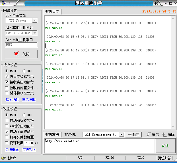 登陸遠程桌面連接,打開一個網(wǎng)絡助手,協(xié)議類型TCP server,服務器IP,本地端口6557和USR-G781一樣,點擊連接。