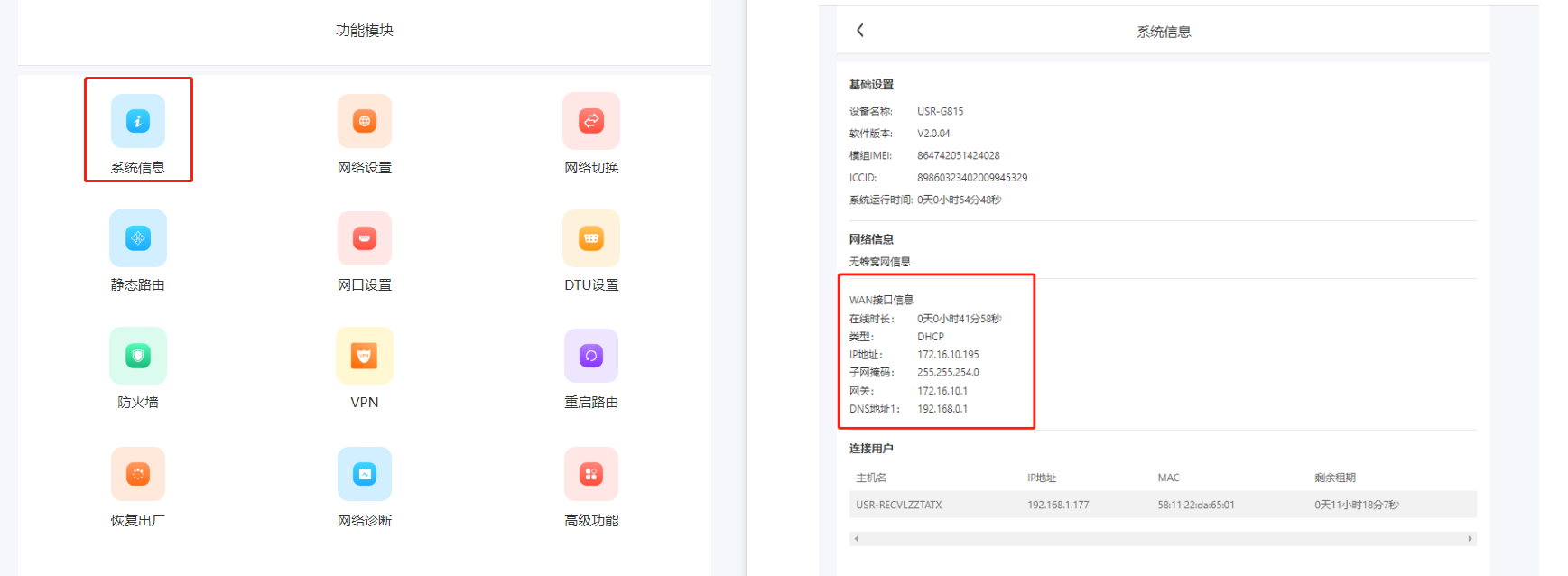 1、 首次使用 USR-G815 設備時,可以通過 PC 連接 USR-G815 的 LAN 口,自動獲取同網(wǎng)段的IP 192.168.1.X,瀏覽器輸入G815的LAN IP:192.168.1.1進入內(nèi)置網(wǎng)頁。