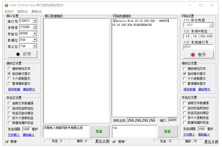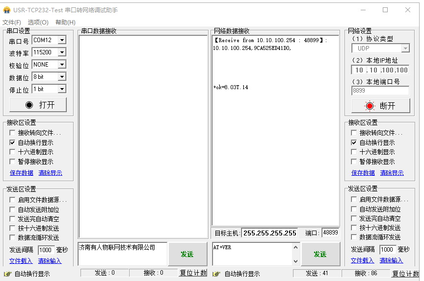 電腦打開網(wǎng)絡助手,協(xié)議類型用UDP,本地IP地址是電腦IP(和W610同網(wǎng)段),本地端口用8899。目標主機必須用255.255.255.255,端口必須用48899(網(wǎng)絡AT指令搜索端口)。